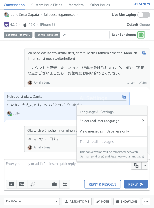 - Agents can type replies only in the selected LAI language (English or Japanese). Outgoing messages are translated into the end user’s language when sent.
