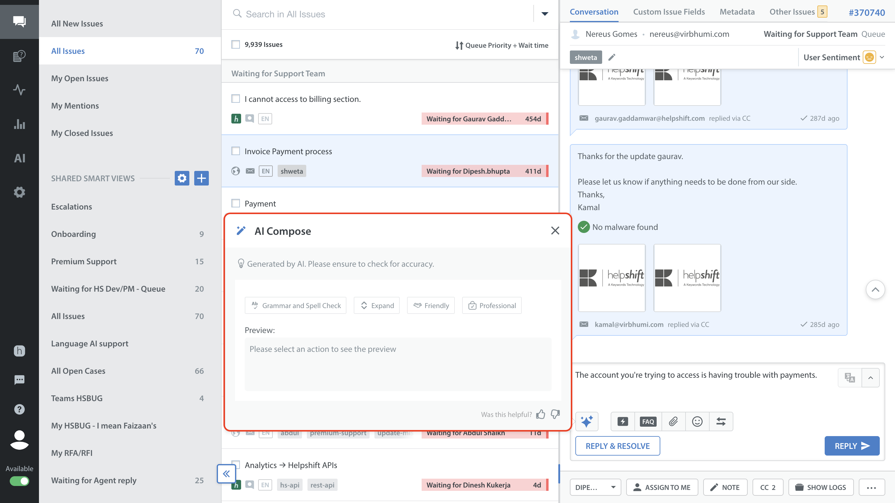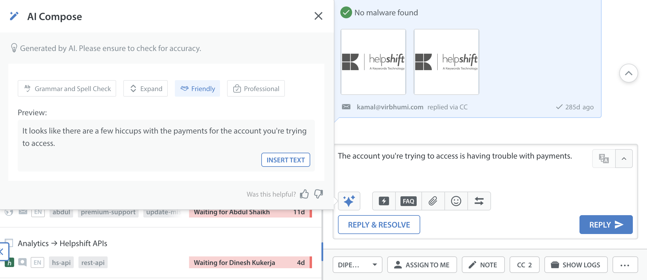 The AI Compose feature assists agents in crafting high-quality responses faster by rephrasing (in a friendly and professional tone), expanding, and correcting grammar and spelling. Reducing the time spent composing messages boosts agent productivity while improving the quality and consistency of responses.