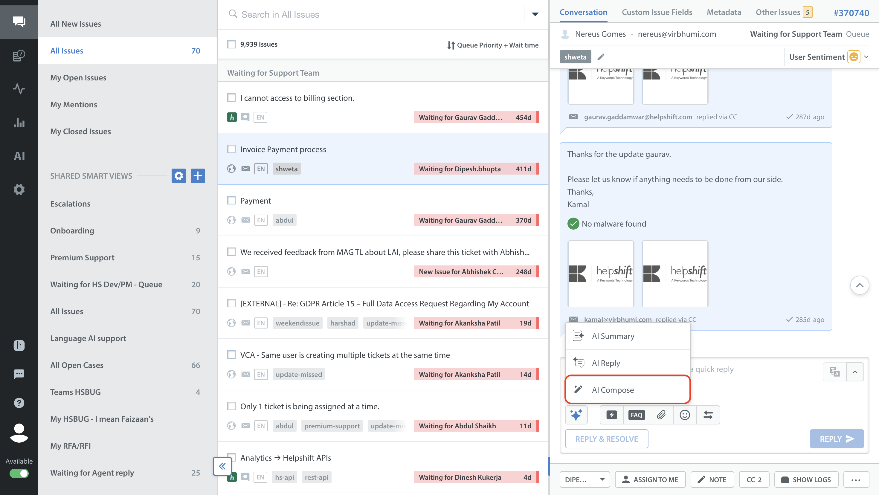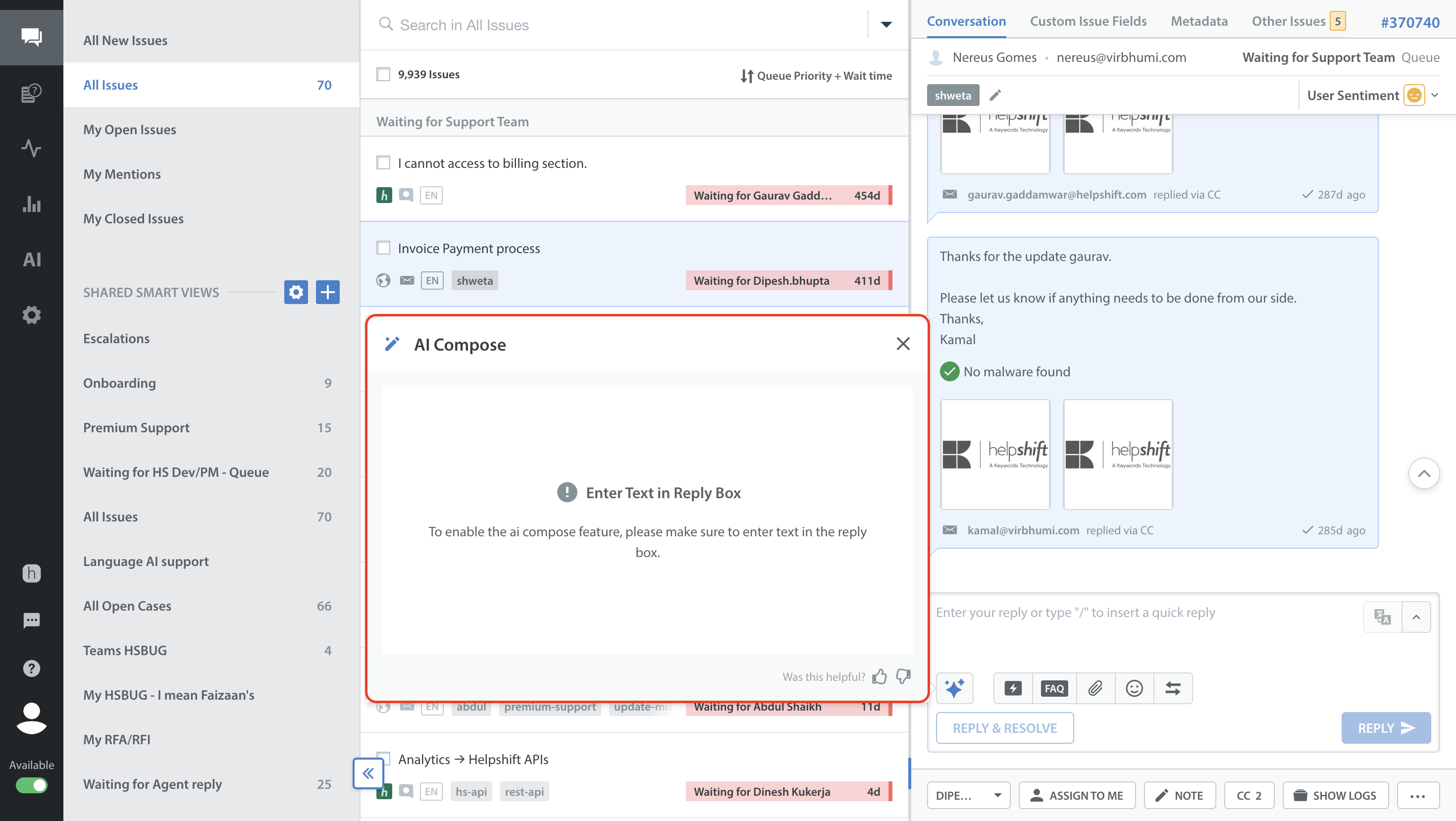 ) below the text input area in the Issue conversation pane. - The icon will display three options: AI Summary, AI Reply, and AI Compose.