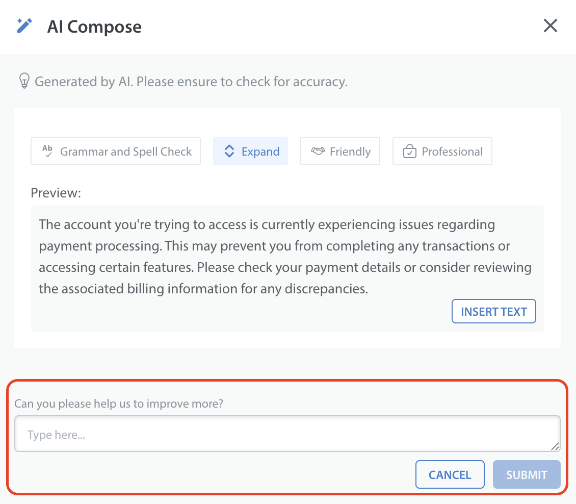 The AI Compose pop-up also includes options for providing feedback. If you rate the AI composed responses with a thumbs-down, a text field will appear for you to input your feedback.