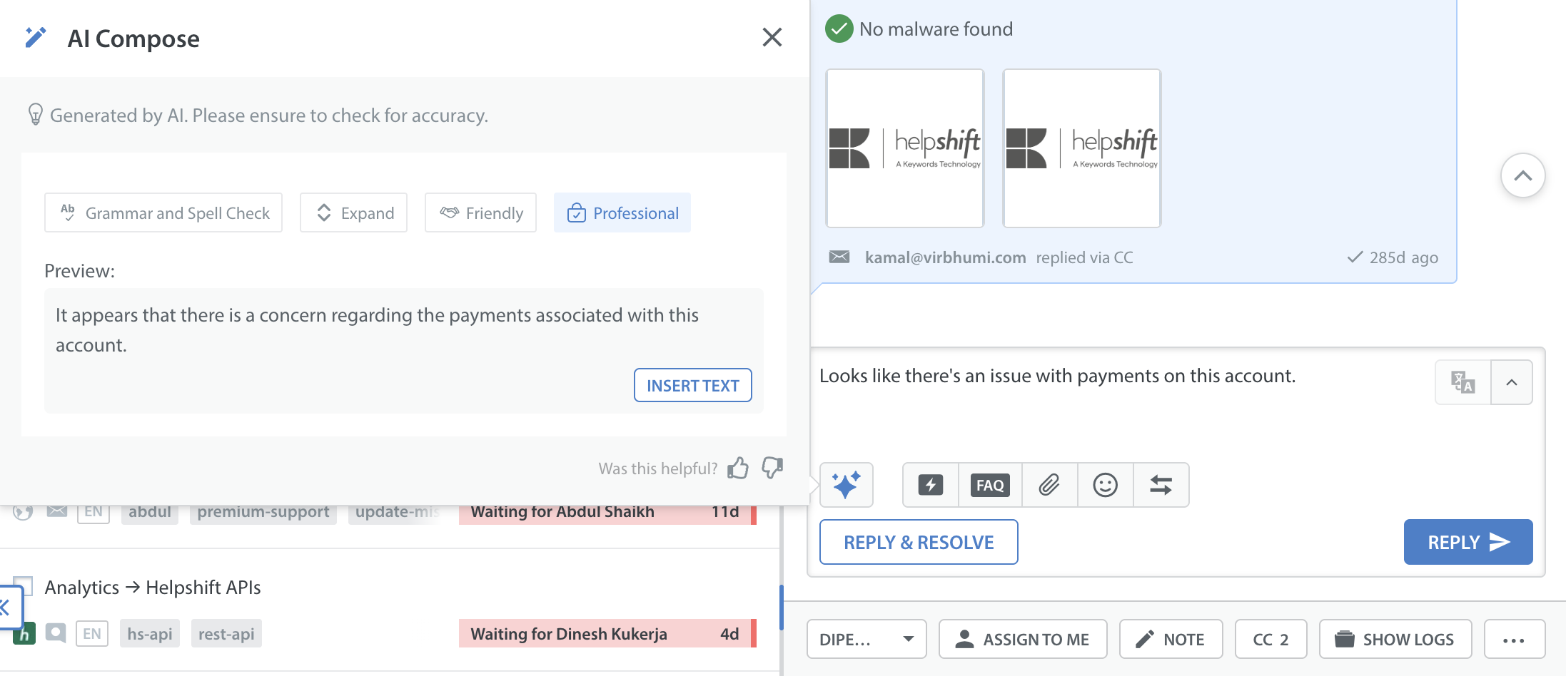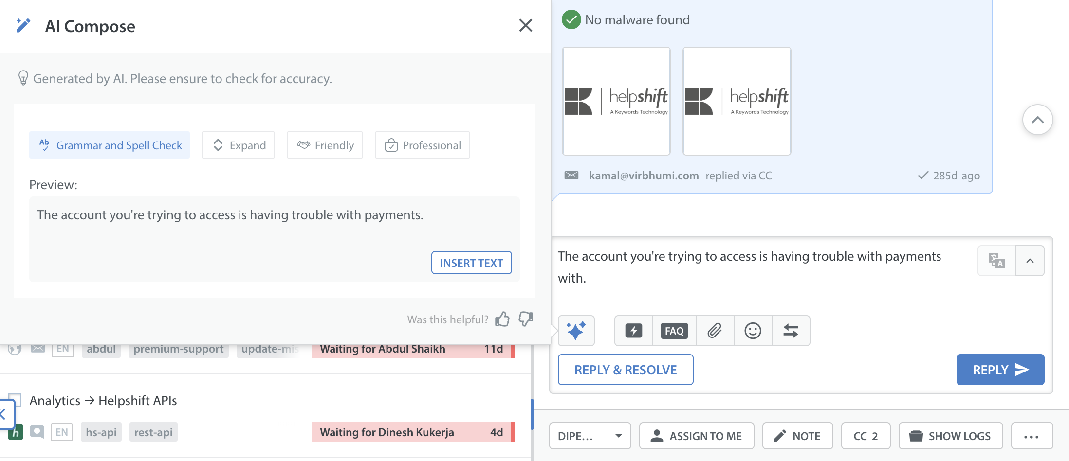 AI Compose works in multiple languages, allowing agents to rephrase, expand, or check grammar in the language they’re using. The composed message will be generated in the same language as the input language typed by the agent.
