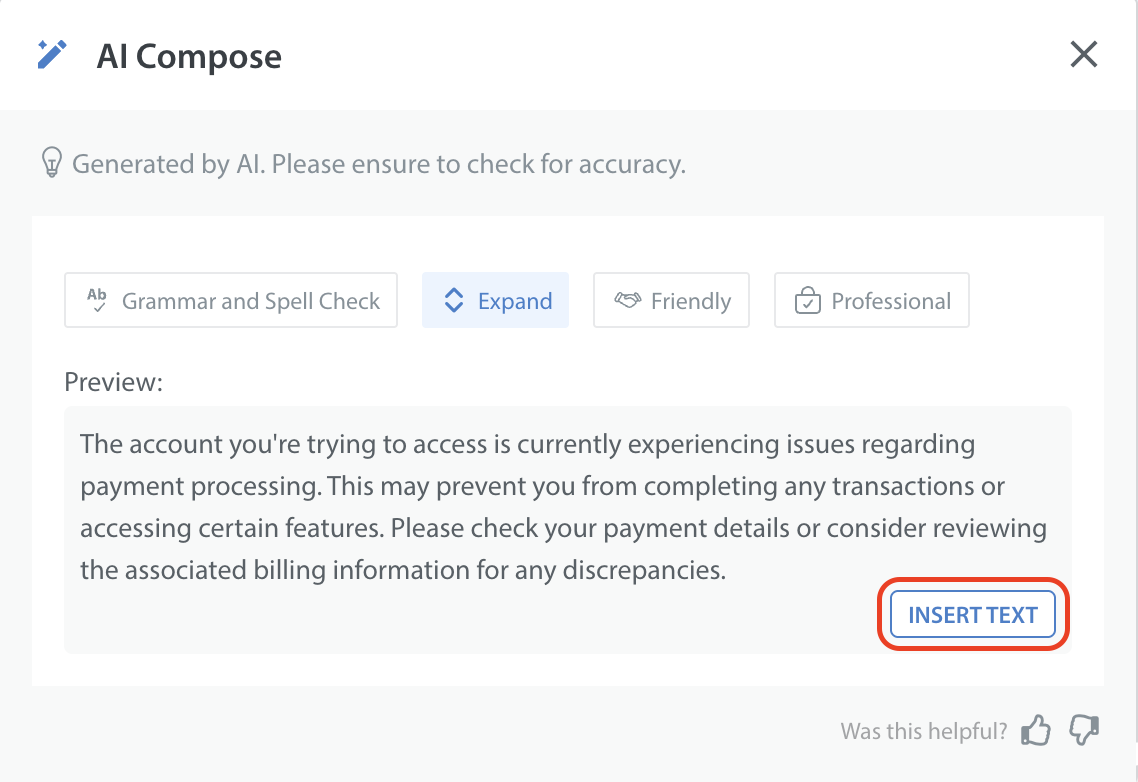 Always verify AI composed messages for accuracy and adherence to your organization’s guidelines before sending them to customers.